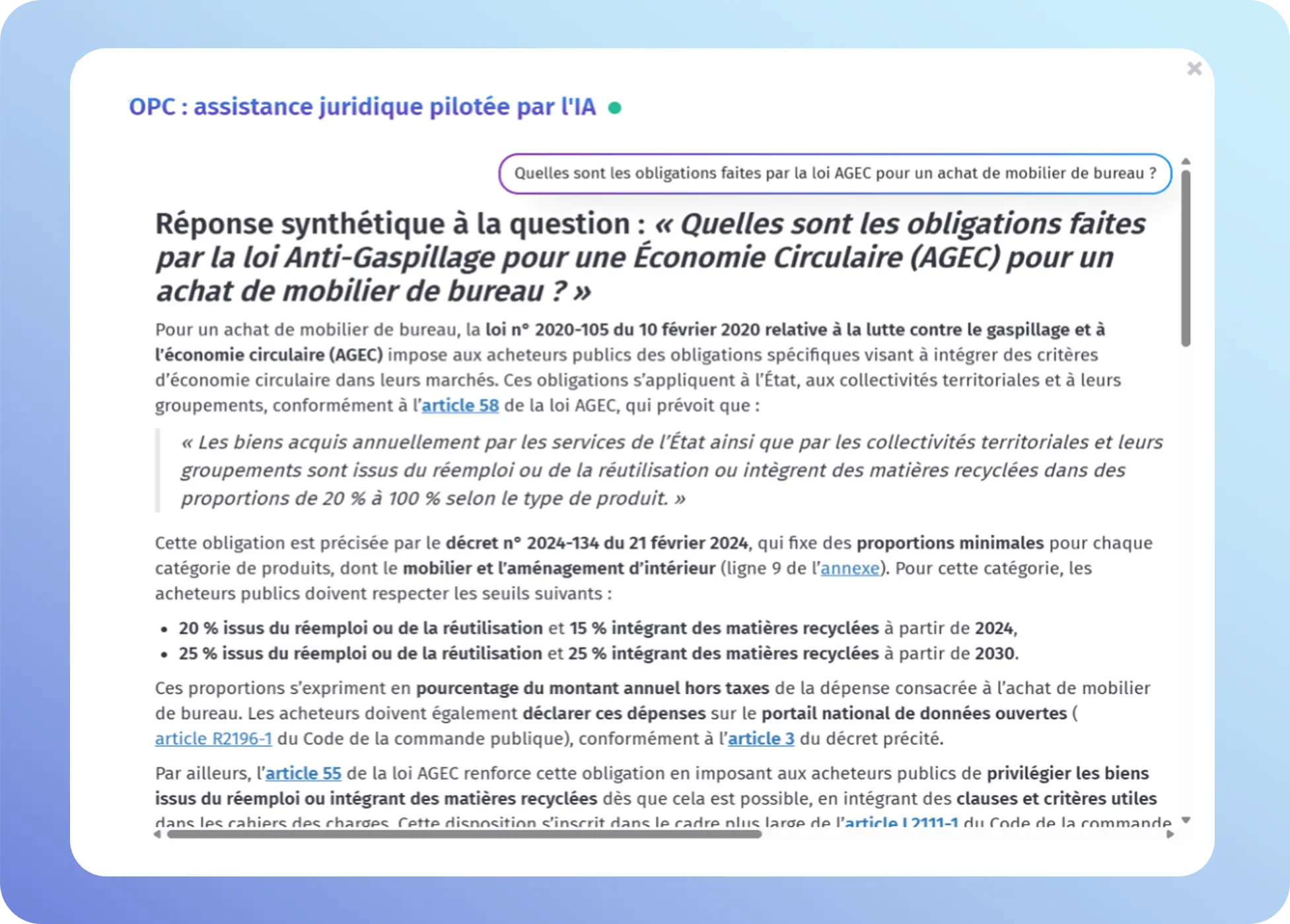 Notre assistance répond aux questions juridiques et opérationnelles de manière précise et structurée. Pour fournir des réponses fiables, nous allons au-delà d’une réponse fondée sur les connaissances du modèle ou une recherche internet. Nous nous basons uniquement sur les textes réglementaires et sur une banque de ressources dûment qualifiées, fiables et régulièrement mises à jour.