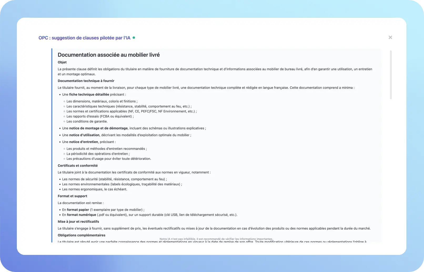 Notre IA génère vos documents à partir des meilleures pratiques de rédaction et des formulations les plus robustes identifiées dans notre banque de clauses. Nous couvrons aujourd’hui les besoins de parangonnage pour les documents de consultation insuffisamment adressés par les outils traditionnels.